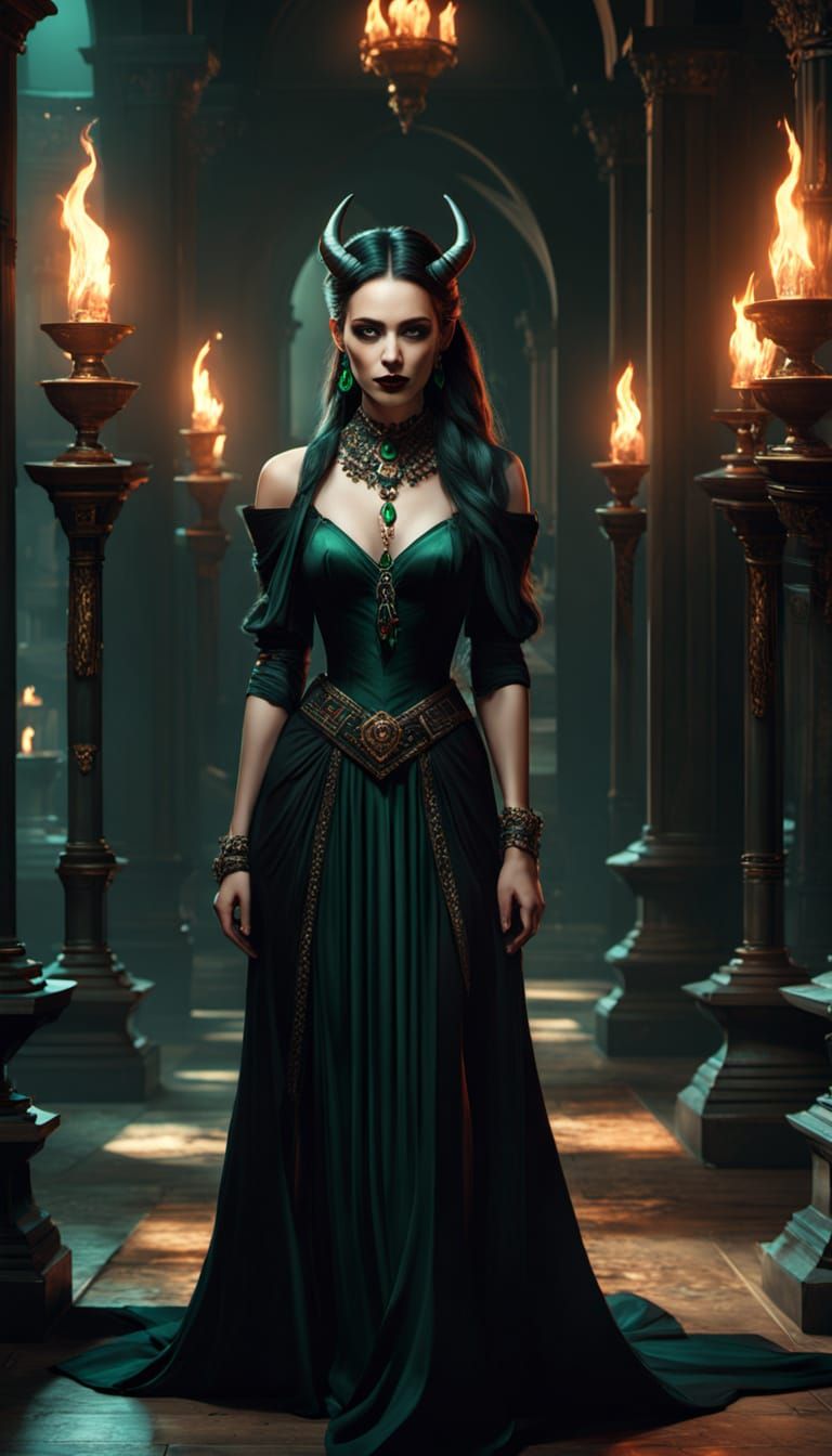This image depicts a female Darkness in a grand hall, surrounded by warm glow and deep shadows, wearing lavish attire with black lipstick and piercing eyes, as part of a dark fantasy portrait with intricate detail and rich colors.