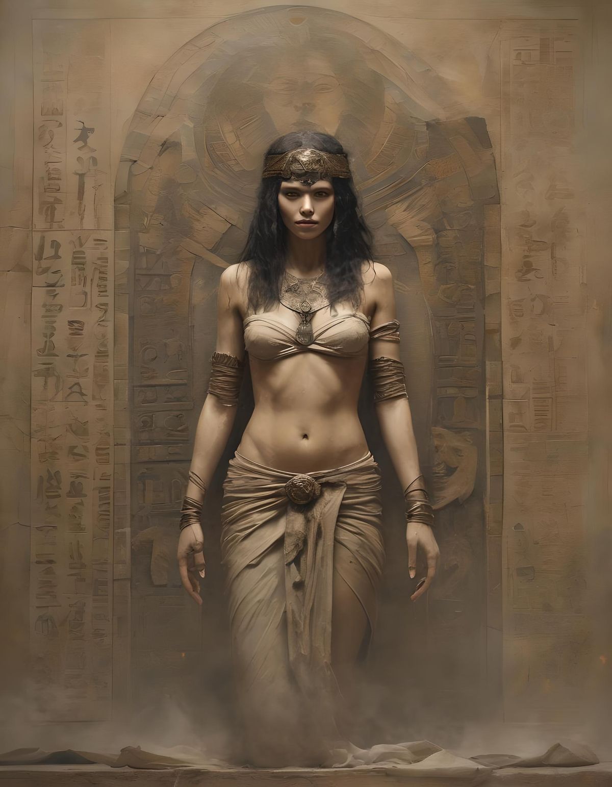 This image shows Cleopatra's mummy emerging from her sarcophagus within an Anubis temple. The linen bandages are adorned with runes, with light and smoke emanating in a dramatic portrait reminiscent of classical painting.