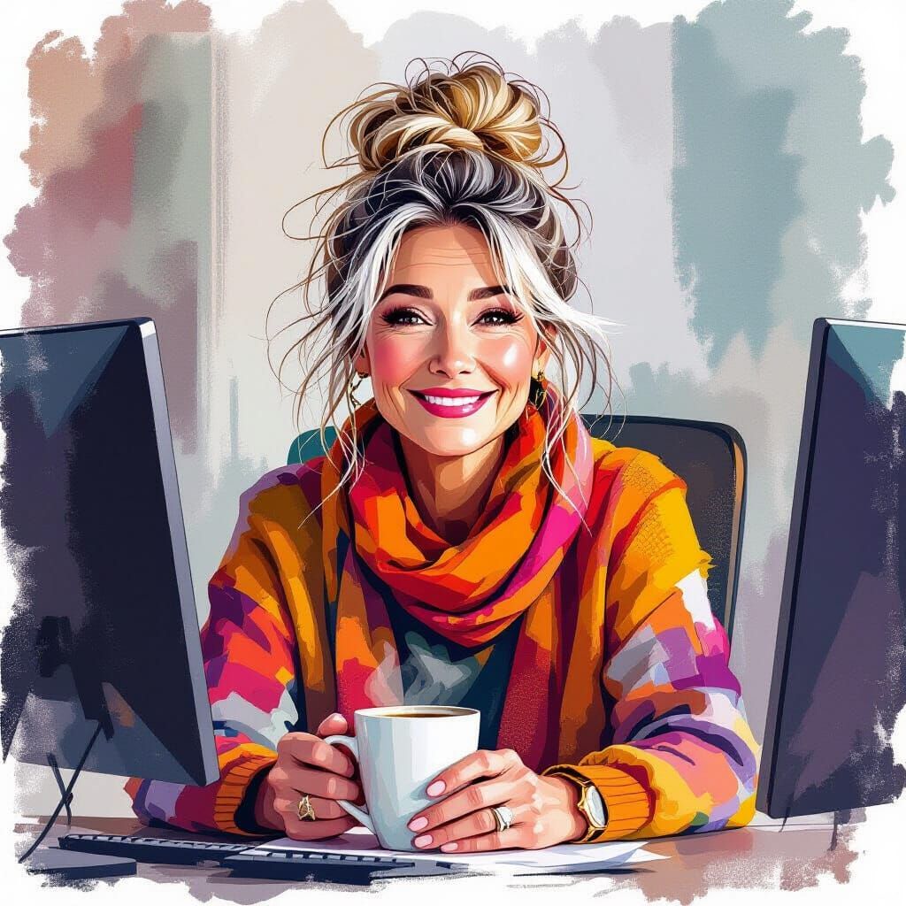 This image shows a caricature of an older woman with a messy bun, smiling with a cup of coffee at her computer. The artwork is rendered in vivid watercolors with detailed lines and textures.