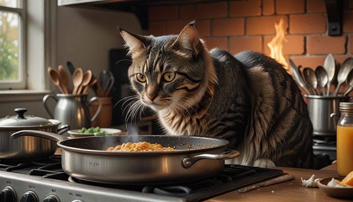 A close-up charcoal drawing of a cat tasting from a steaming pot on a stovetop, with exquisite detail and high contrast lighting, reminiscent of the Dutch Masters style