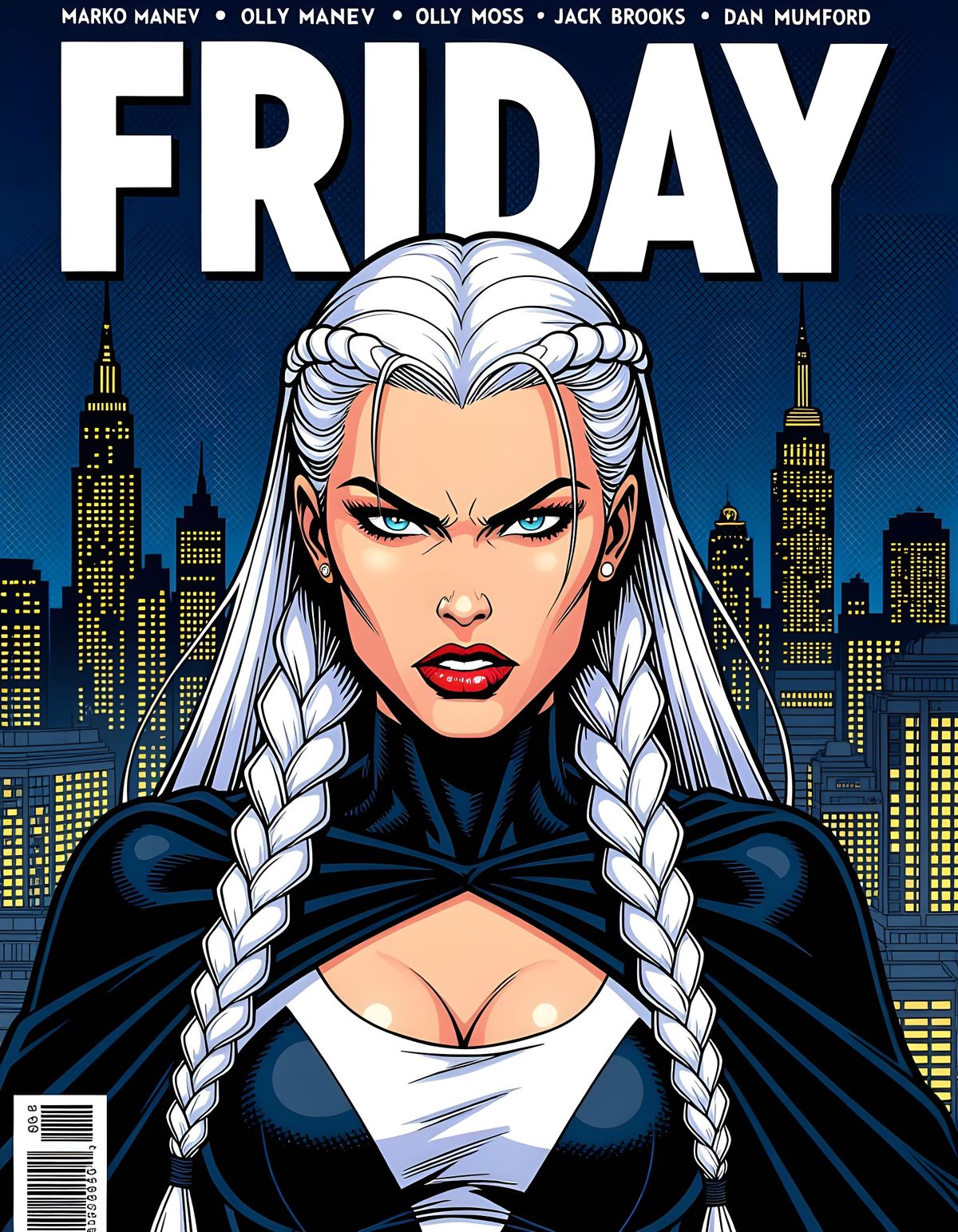 This image shows a powerful female supervillain with white-gray hair and an angry expression, wearing a black costume and cape. The background features a modern city at night, rendered in a vibrant comic book art style with bold lines and dramatic shadows.