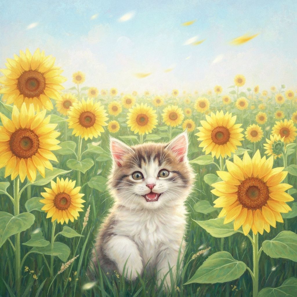 Easily create your own adorable kitten and sunflower images with our free AI image generator.