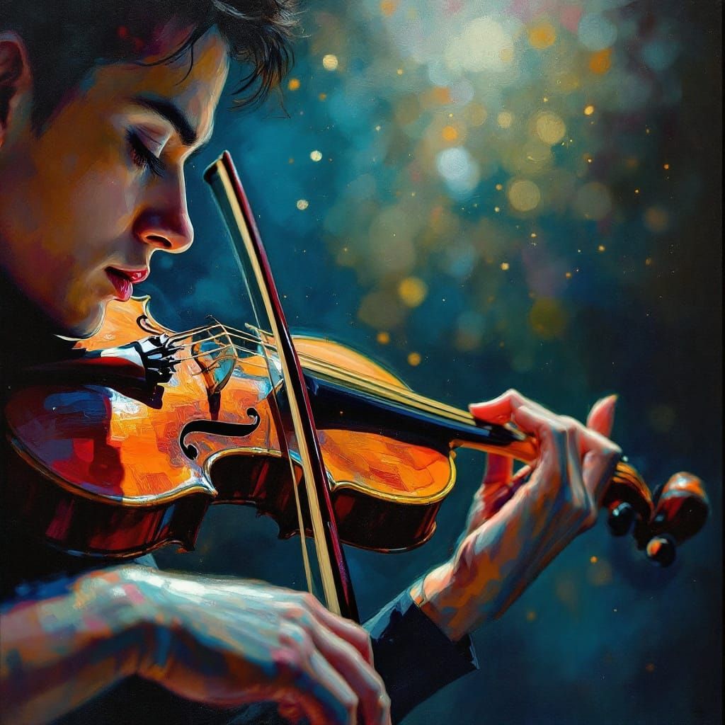 This image shows a close-up of a violinist on stage, captured in a vibrant oil painting style with expressive brushstrokes. Dramatic lighting enhances the emotional resonance of the scene.