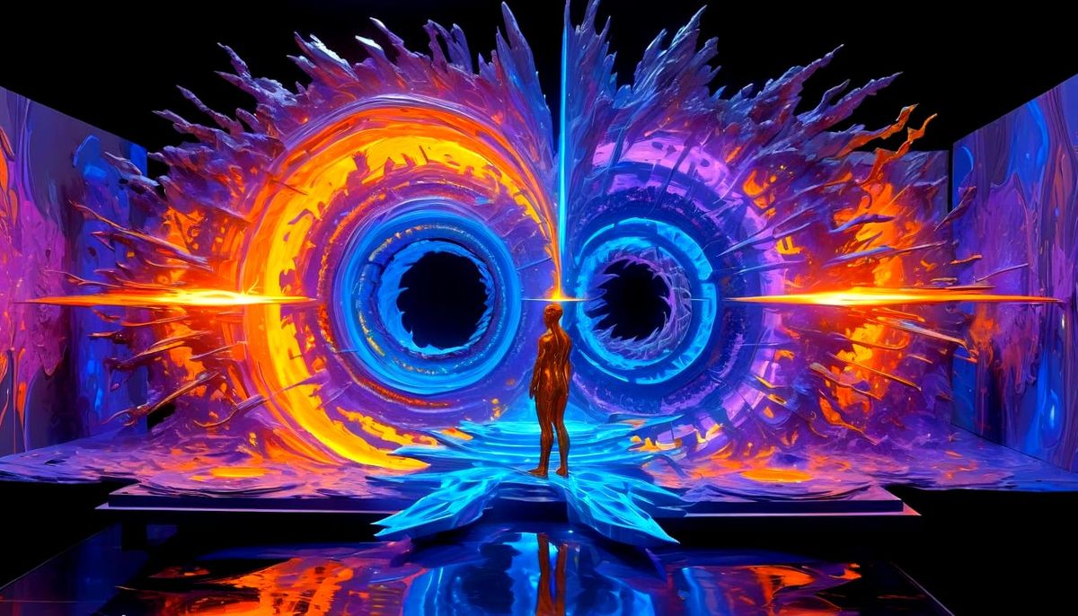 This image shows 3D quantum human sculptures that shimmer with shifting forms, creating a perspective-altering presence. The artwork evokes physics-defying concepts with a UV blacklight effect.