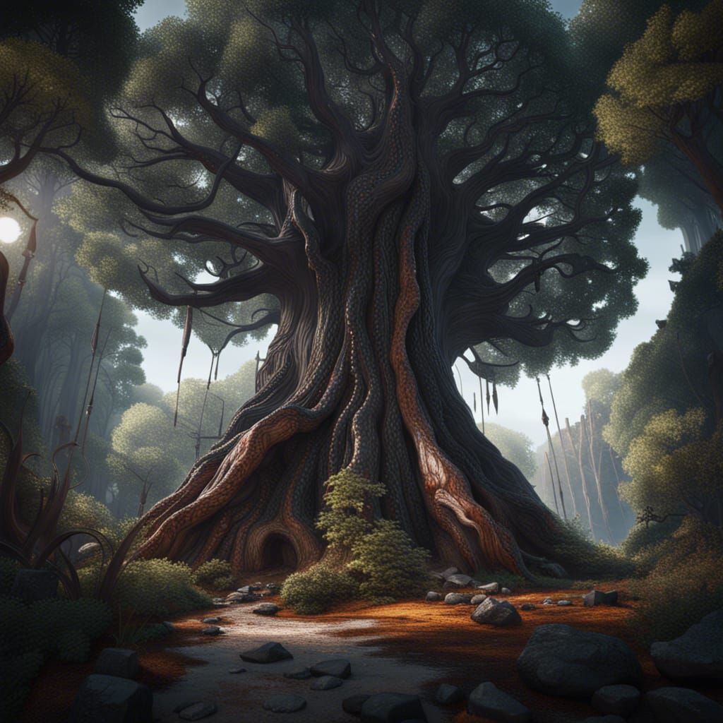 A striking picture of a tree with white diamonds embedded in its bark. This digital painting features intricate details, deep colors, and a fantastical aesthetic reminiscent of concept art.