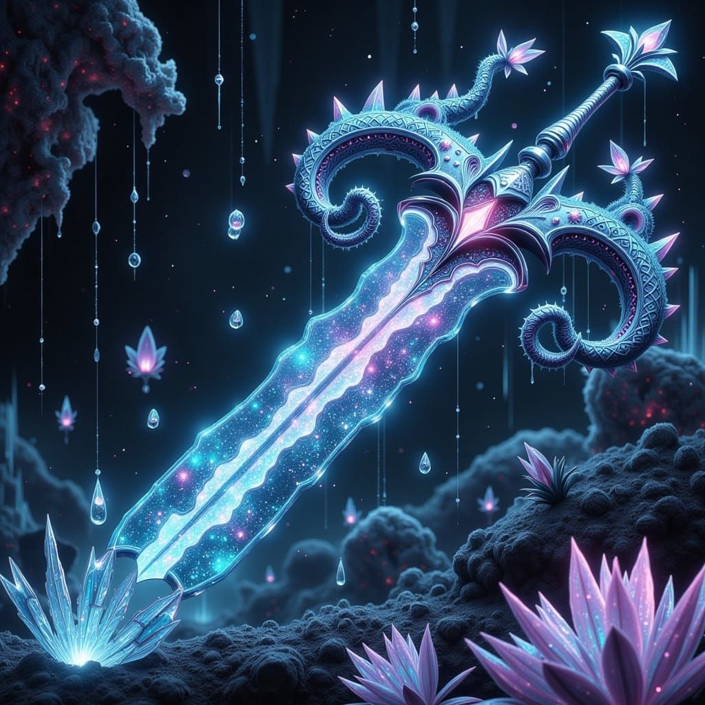This image features a sword with an iridescent blade, shimmering dragon scales, and a velvety fur hilt, surrounded by dark bioluminescent tendrils and an otherworldly landscape with crystalline formations and ambient energy