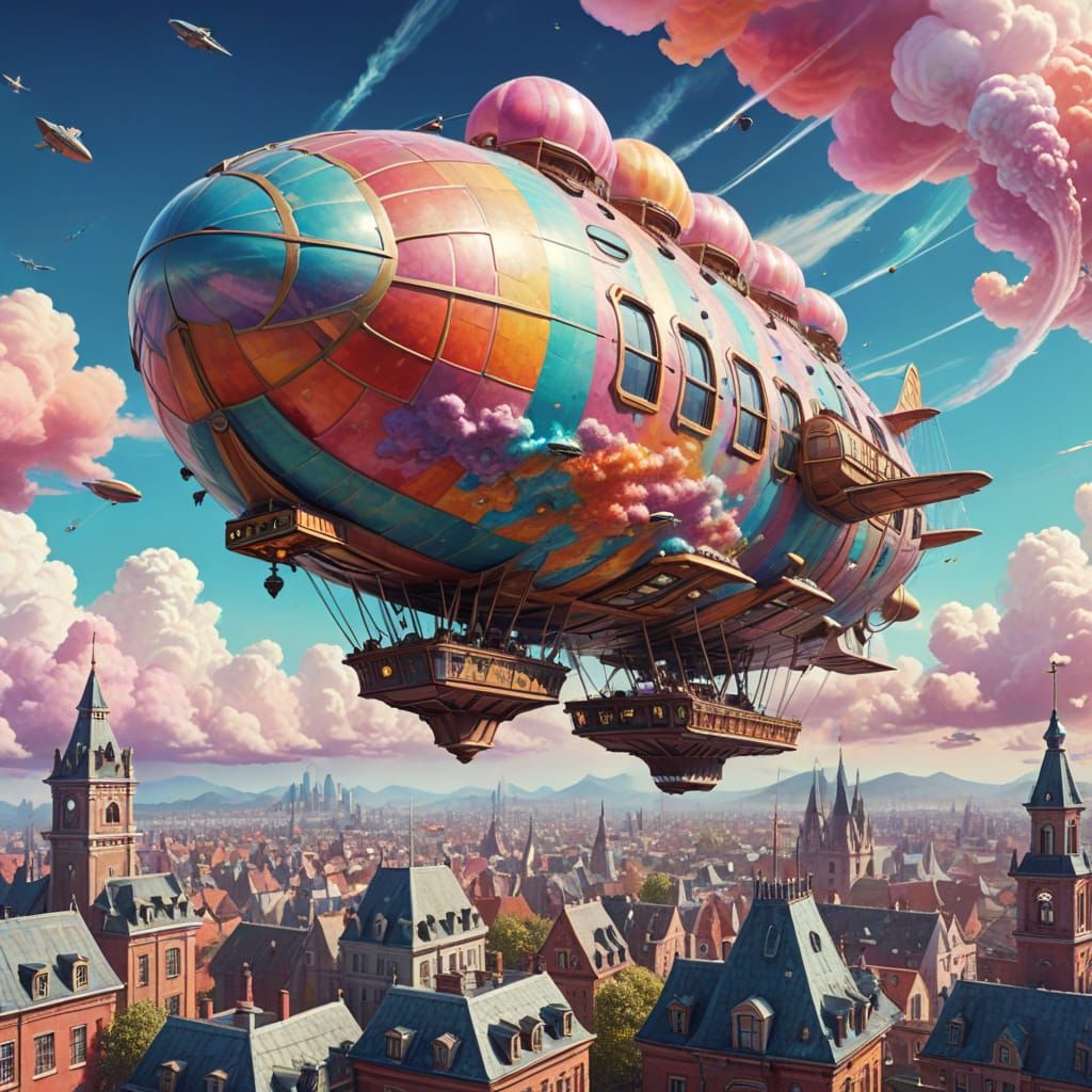 This image shows a retro-futuristic airship floating above a fantasy city. The vintage advertisement style evokes a whimsical gouache painting with colorful candy clouds and a vibrant pastel color scheme.