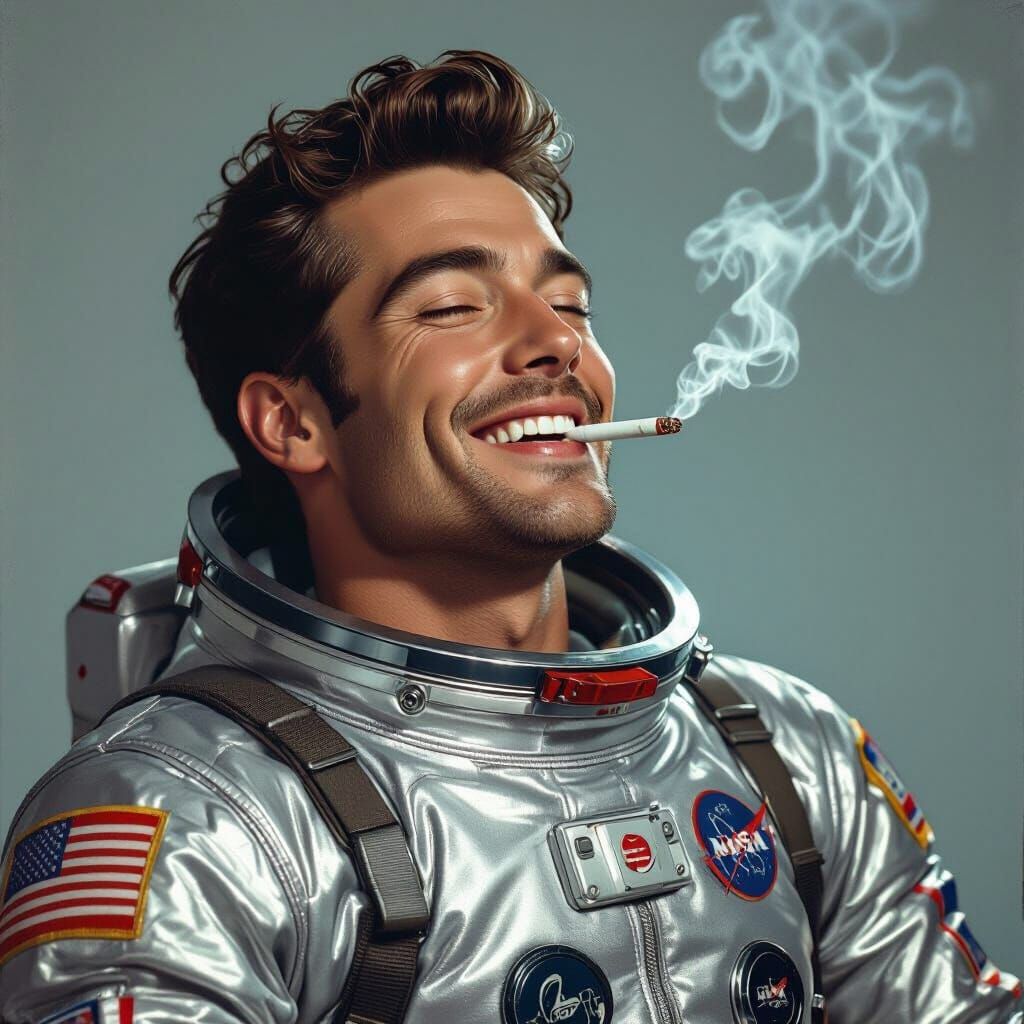 This image shows a Mercury astronaut in a silver suit, exhibiting a cheeky grin while smoking. The artwork has a retro-futuristic aesthetic with cinematic lighting, reminiscent of noir film.