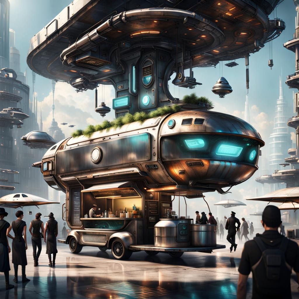 This image depicts a futuristic steampunk food truck hovering in a space environment, bustling with customers being served in the afternoon light. It is rendered in a futurepunk aesthetic.