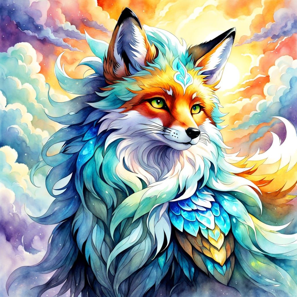 This watercolor illustration features a stunning, close-up portrait of a fantastical fox with iridescent fur and a flowing mane, set amidst swirling clouds and soft, golden light.