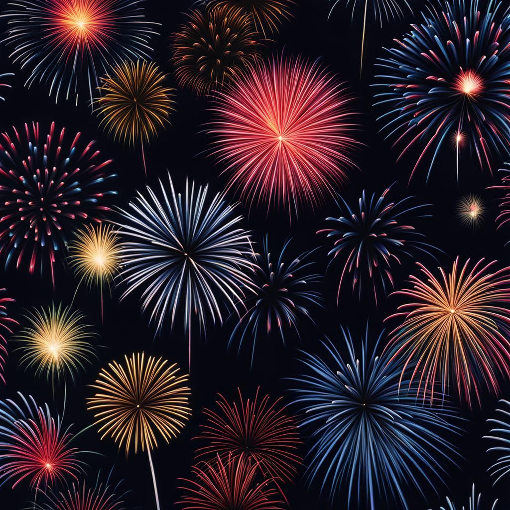 This image shows vibrant fireworks exploding in a night sky. The display features a variety of colors and patterns, illuminating the darkness with a festive glow.