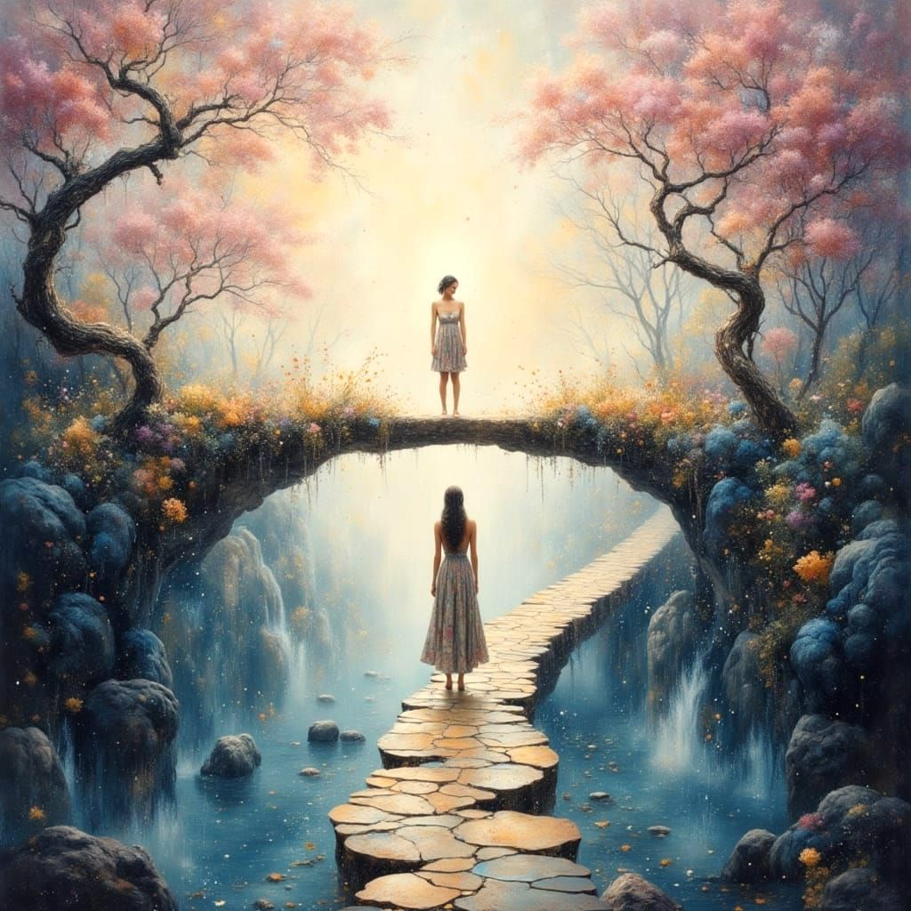 This image depicts a symbolic bridge representing life's stages and transformation. Rendered in a soft, light-filled pastel palette with intricate bohemian details and painterly textures.