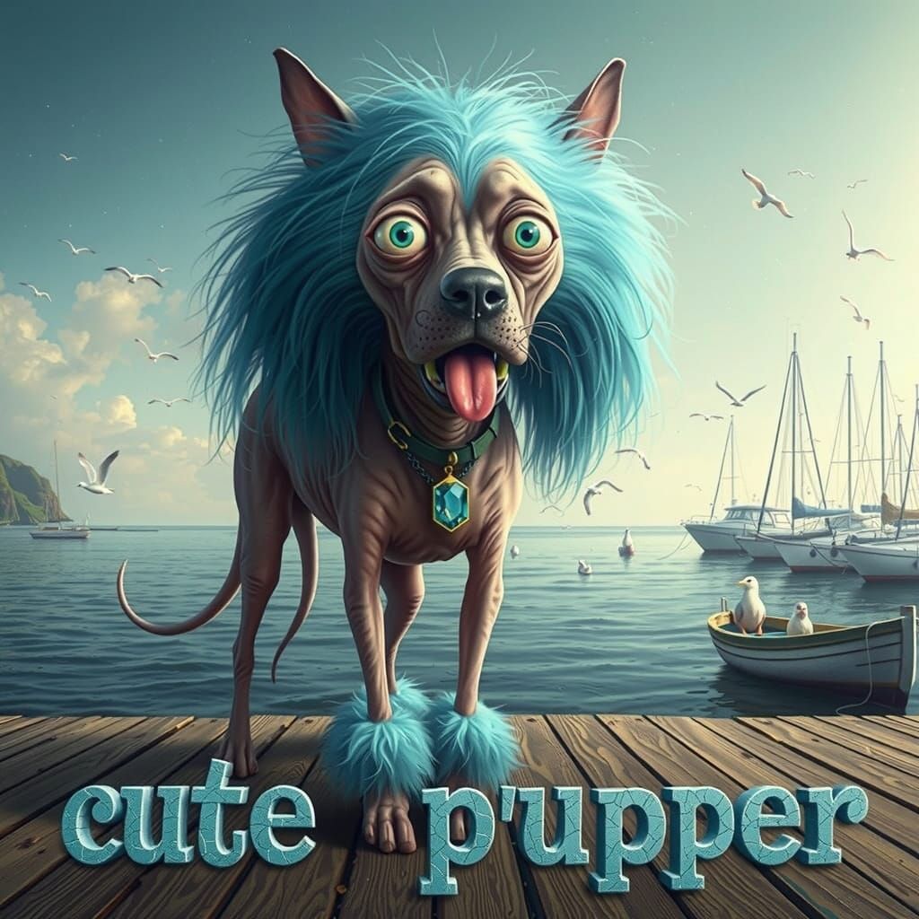 A scrawny, wrinkled, hairless beige dog with a long thin snout, one long yellowed tooth and tongue hanging out, oversized paws, huge bulging bloodshot eyes, and a stupid blank expression. Wearing a long scraggly aquamarine fright wig, aquamarine tufts of fur on the top of it's tail, aquamarine tufts ...