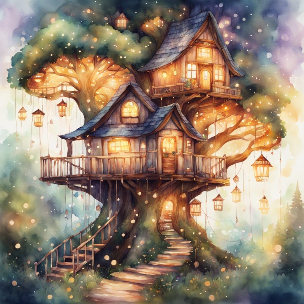 This image shows a charming treehouse nestled amongst vibrant foliage, rendered in a whimsical watercolour style. Twinkling string lights and soft mushroom caps add to the serene and ethereal atmosphere.