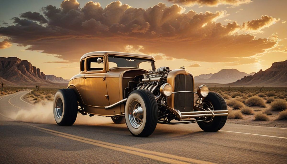 This image shows a classic hotrod speeding down a desert highway as the sun sets. The scene has a grainy, vintage feel, reminiscent of classic street photography with retro-futuristic styling.