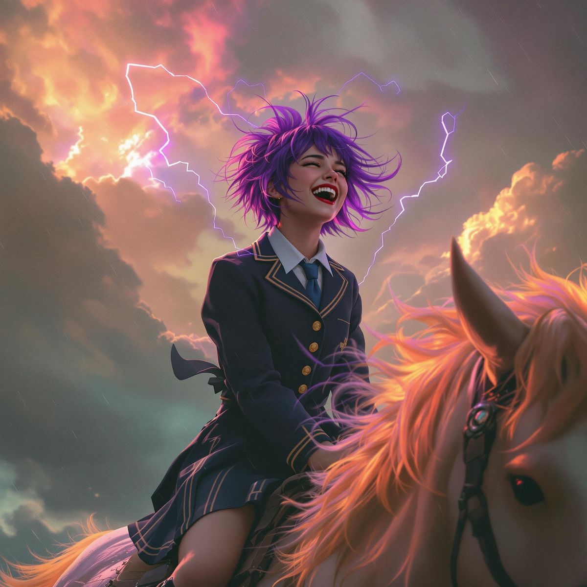 A vibrant image of a punk teenage girl with purple hair riding a phantom horse through a stormy sky. The dynamic scene is reminiscent of digital artwork with bold brushstrokes and vivid lighting.