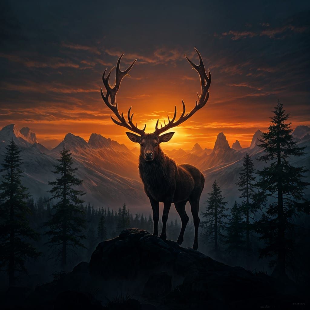 A stunning painting of a regal stag with Celtic runes-adorned antlers, set against a misty mountaintop and fiery sunset. Rendered in rich, dramatic colors, this artwork captures the essence of wild beauty and untamed nature.