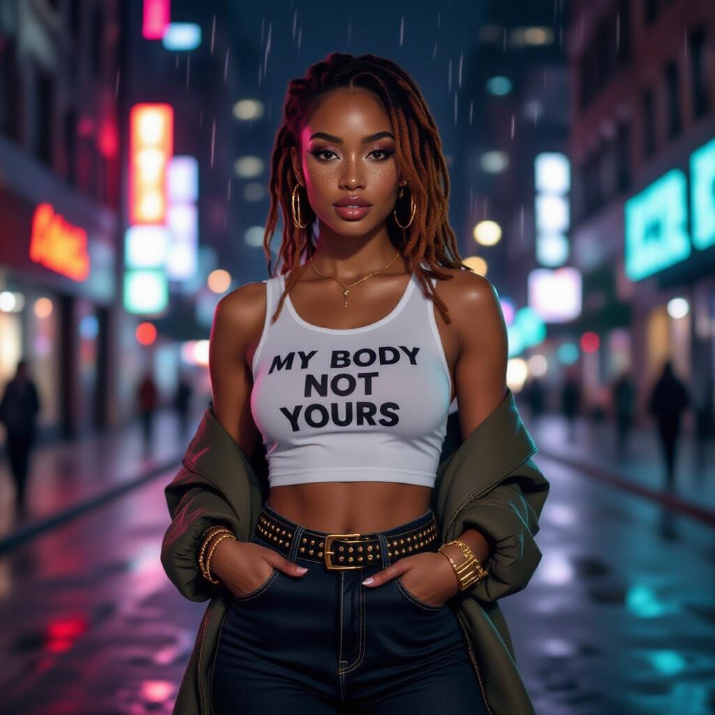 A photorealistic image of a Black woman in a neon-lit city street at night. Rain glistens on the pavement, reflecting vibrant pink and blue lights. She wears stylish urban attire, exuding a confident, rebellious aura.