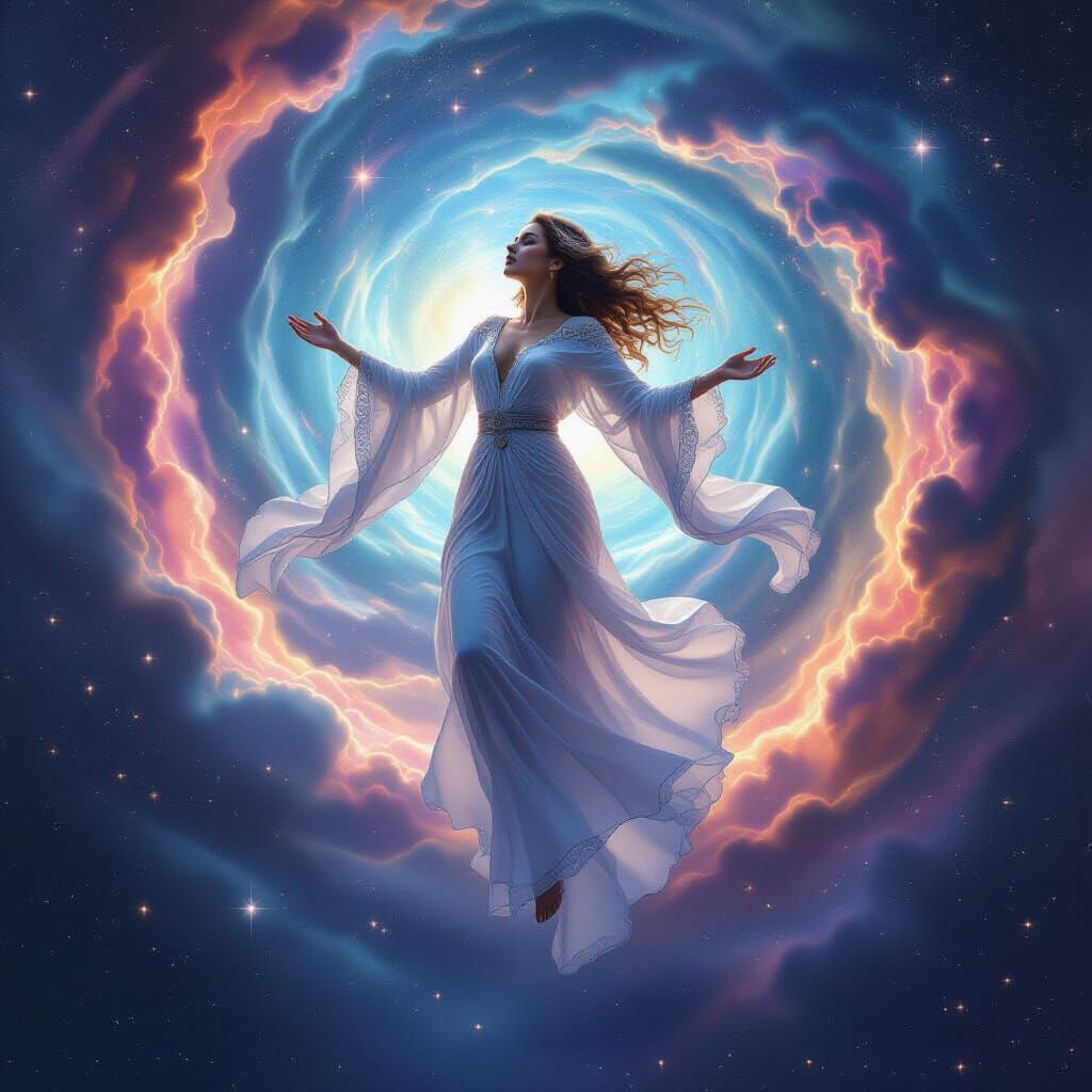 A striking picture of a woman in flowing robes levitating above a swirling cosmic vortex. Her outstretched hands appear to conduct celestial energies amidst shimmering stardust and distant galaxies in a psychedelic art style.