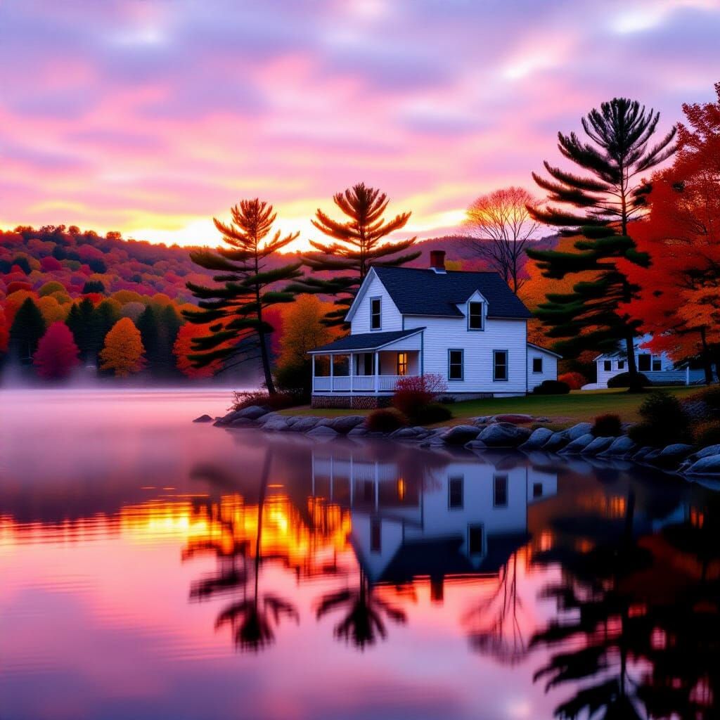 This image depicts a serene lakeside cottage bathed in the warm light of an autumn sunrise in Vermont. The scene captures the peaceful beauty of the natural landscape.