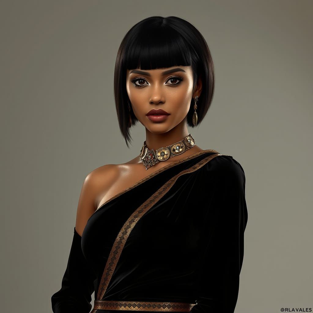 A striking portrait of a confident woman with dark features and a bob haircut. The image showcases dramatic lighting and intricate details in an ornate, hyper-realistic style.