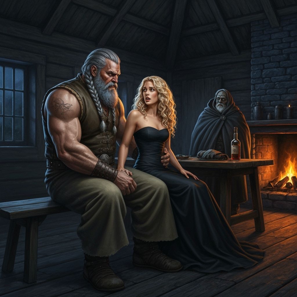 This image depicts a gray-haired Viking holding a blonde woman in a dimly lit, old wooden hut. The scene includes a deceased old man by the fireplace and a bottle of drink on the table, all rendered with dark, mystical, ominous tones.