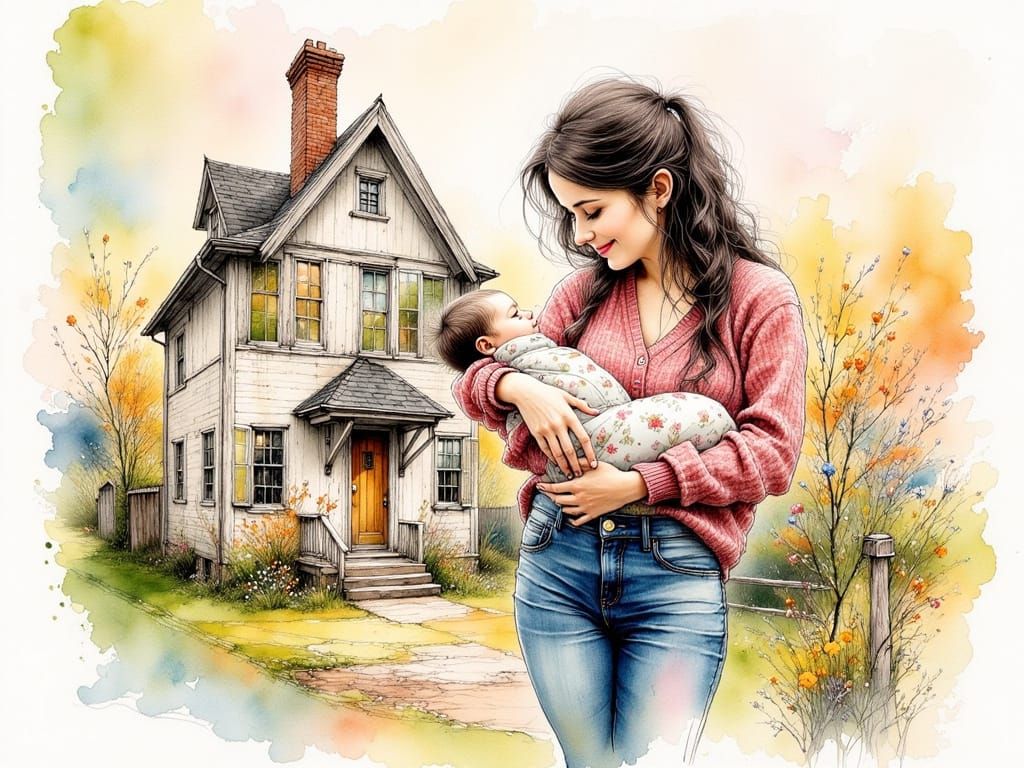 A heartwarming scene of a young couple and their newborn baby standing outside a charming colonial-style house, captured in a beautiful ink drawing style with bold lines and soft watercolor textures.
