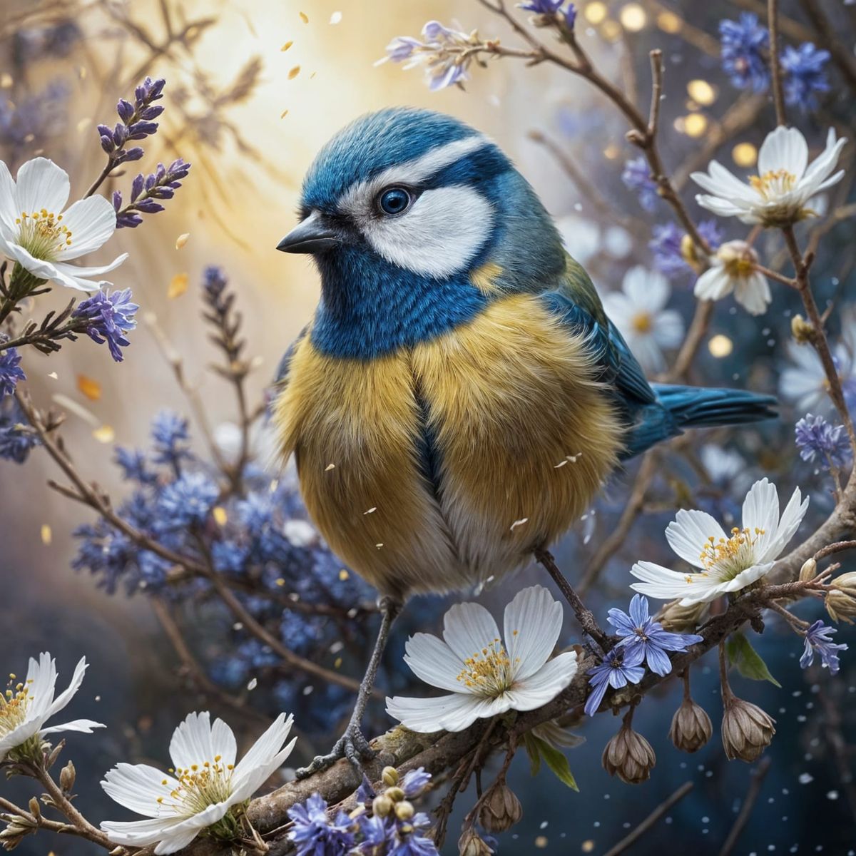 A close-up watercolor painting of a blue tit perched on a flowering branch. The artwork features a soft pastel palette, delicate details, and warm, ethereal lighting in a dreamy, high-fantasy style.