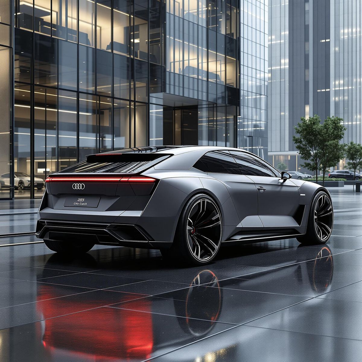 A futuristic Audi concept car parked on wet pavement in a city. The hatchback features a matte grey finish, black accents, and red brake calipers, rendered with photorealistic lighting.