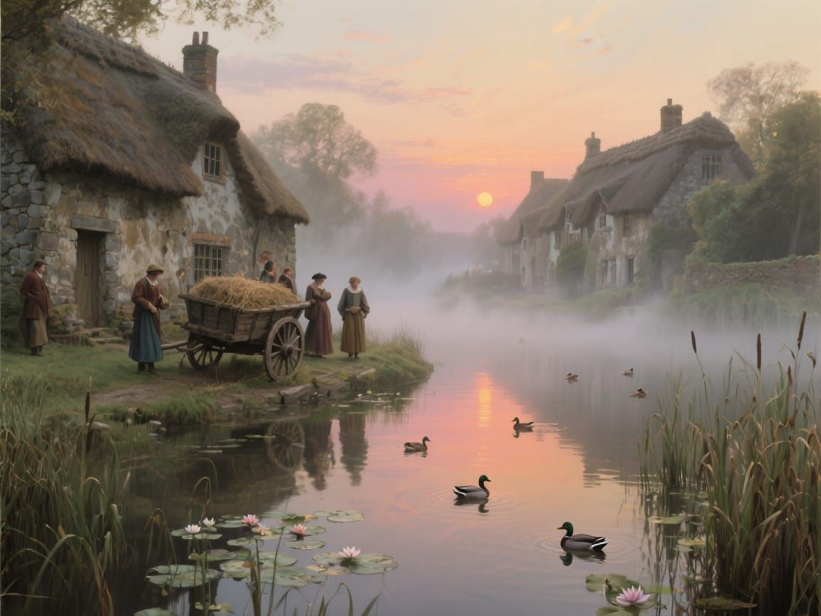This image shows an Elizabethan village scene at sunrise, complete with a pond, stone cottages, and villagers in period attire. The hyperrealistic rendering captures the textures and light of the scene.