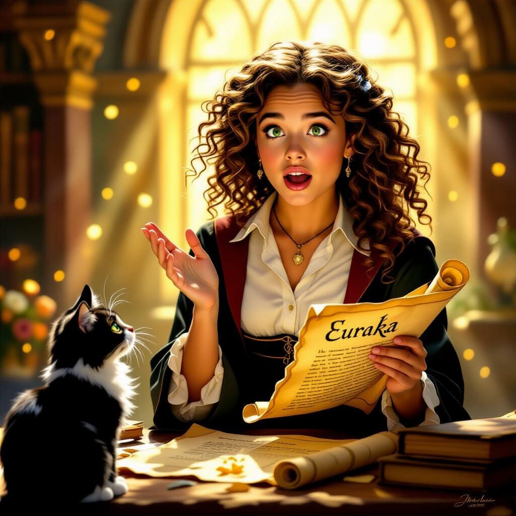 A striking picture of a young scholar discovering an ancient scroll. Golden lighting and whimsical details create a scene reminiscent of classical paintings, capturing a moment of intellectual excitement in a romantic style.