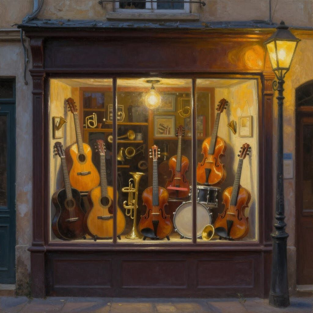 This image shows a charming, old-fashioned music shop window display filled with vintage instruments, illuminated by streetlamp glow at dusk. Rendered in a realistic oil painting style with rich textures and deep shadows.