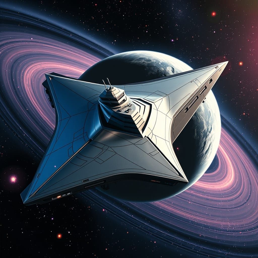 This image showcases a futuristic starship blending sleek Star Trek lines with angular Star Wars Star Destroyer design, set against a breathtaking ringed planet with vibrant stars and stardust