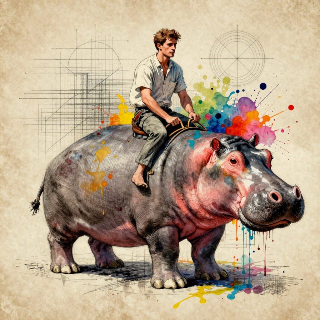 This image depicts a man riding a hippopotamus, created with a blend of pencil, ink, and watercolor. It features a grunge aesthetic with architectural elements on vintage parchment, rendered in bright, contrasting colors.