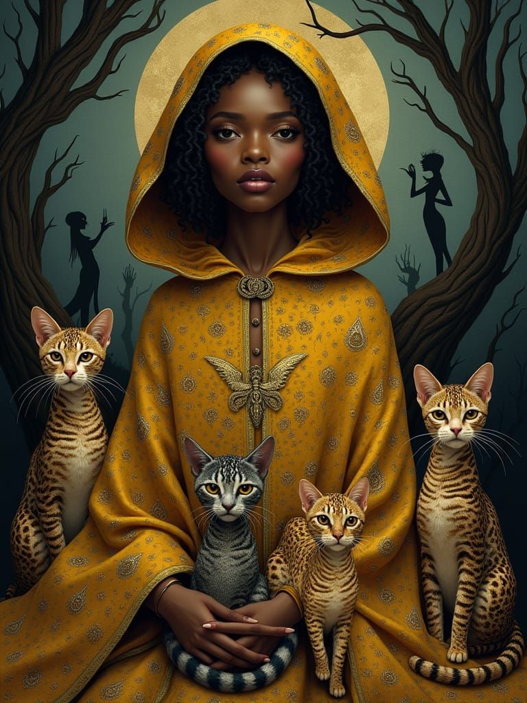 This enchanting image features a mystical African American woman surrounded by majestic, patterned cats in a dimly lit, mystical atmosphere, reminiscent of Byzantine-inspired mosaics with a touch of Tim Burton's whimsy and hyper-realistic detail.