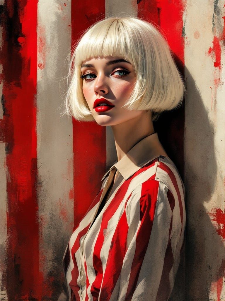This elegant illustration features a woman with a platinum bob, confident expression, and bold red lips, set against a striking backdrop in a sophisticated vintage style with soft pastel colors and textured strokes.