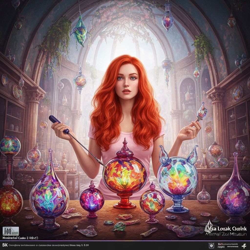 This image shows a beautiful redhead woman with bioluminescent, colorful glass. The intricate artwork is crafted with cristallo techniques and set in an animal zoo museum, rendered with rainbow iridescent details.