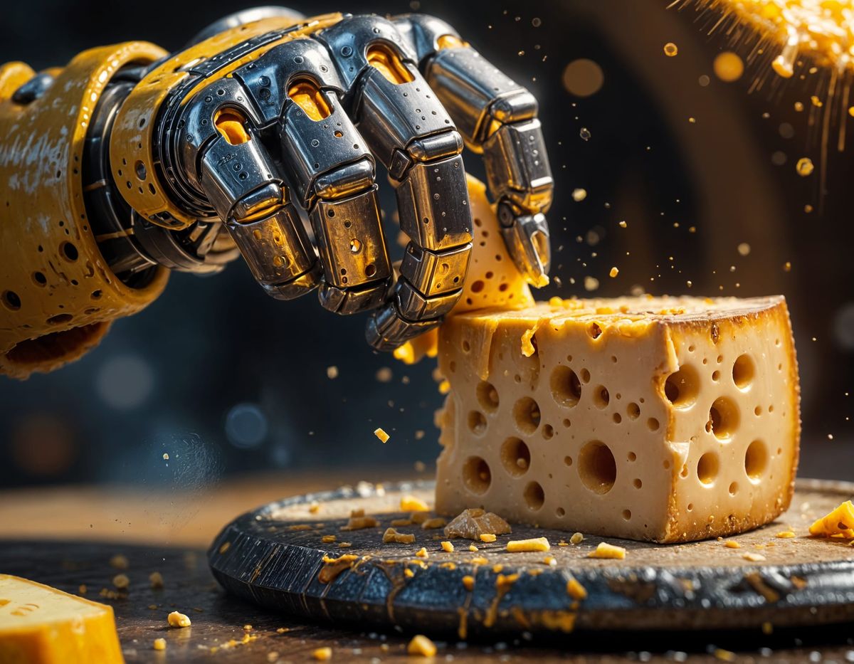 A close-up concept art image of a robot punching a cheese wheel. The macro photograph highlights the crumbling cheese texture and a shining metallic fist in a vibrant oil painting style.