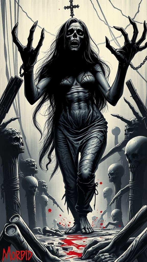 This haunting image depicts a woman's transformation into a dark, otherworldly entity, surrounded by the gritty, urban environment of a zombiecore-inspired world. A fusion of unsettling storybook illustration and split-horror graffiti, this piece embodies the essence of the underground novel genre.