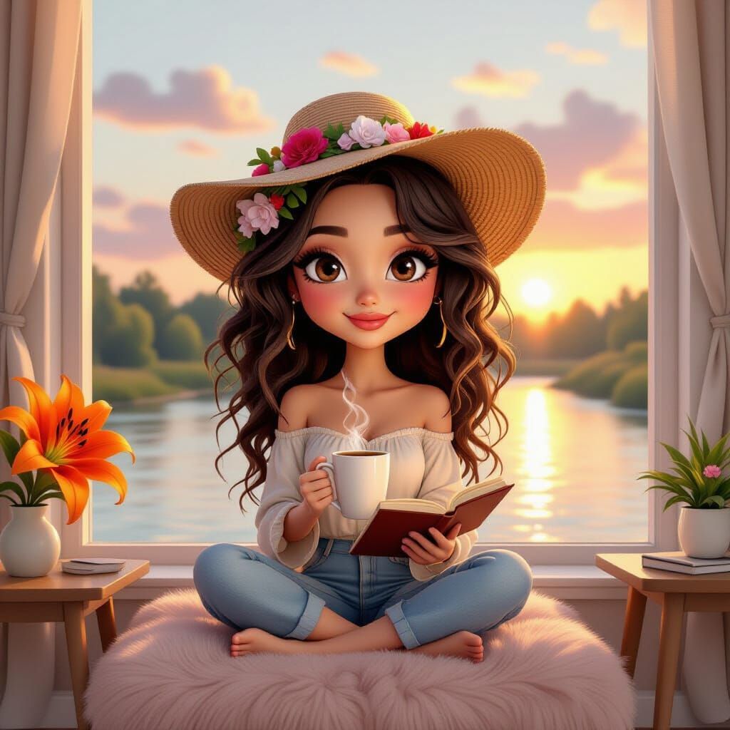This image shows a 3D caricature of a cute woman with curly hair and a floral hat, sitting by a window overlooking a river at sunrise. The scene is reminiscent of a cozy lofi dreamscape.