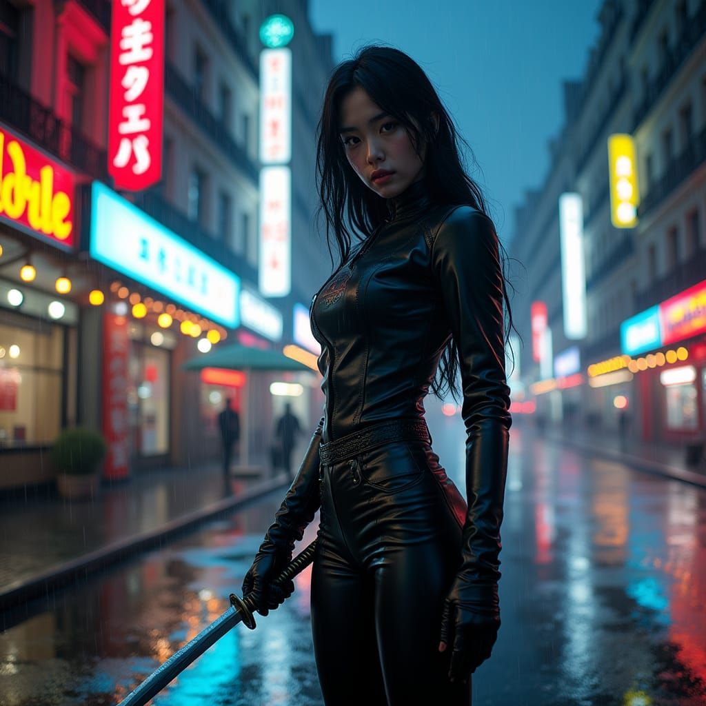 A young woman in black leather stands heroically atop a Parisian apartment block, surrounded by vibrant advertisements and neon lights. Inspired by film noir and Japanese-French cinematography, this cinematic image captures a dark, moody atmosphere with a hint of otherworldly glow.