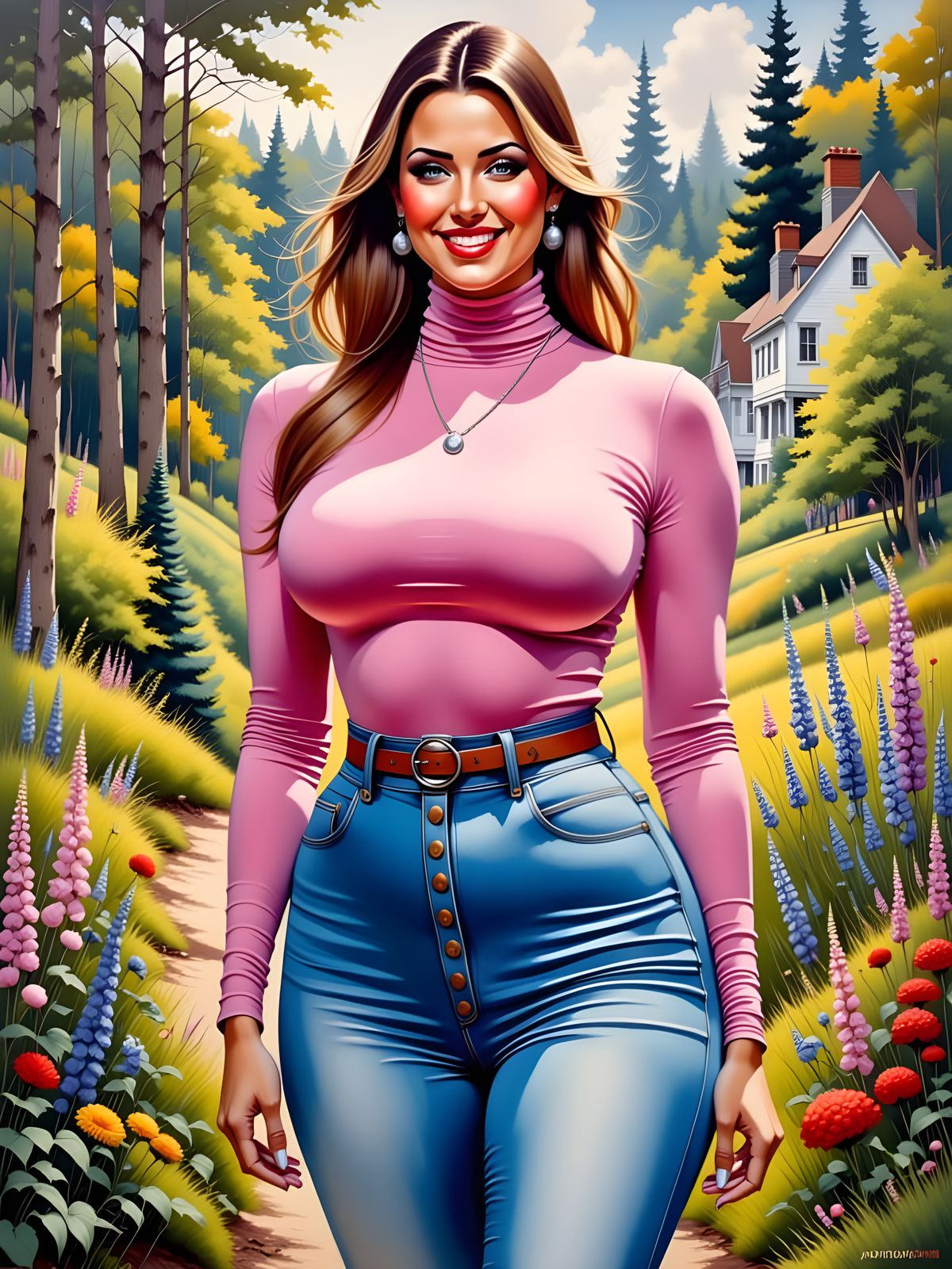 This image shows a beautiful, smiling woman in a garden setting. She is wearing a pink turtleneck, high-waisted jeans, and pink boots, depicted as a vibrant, detailed oil painting.