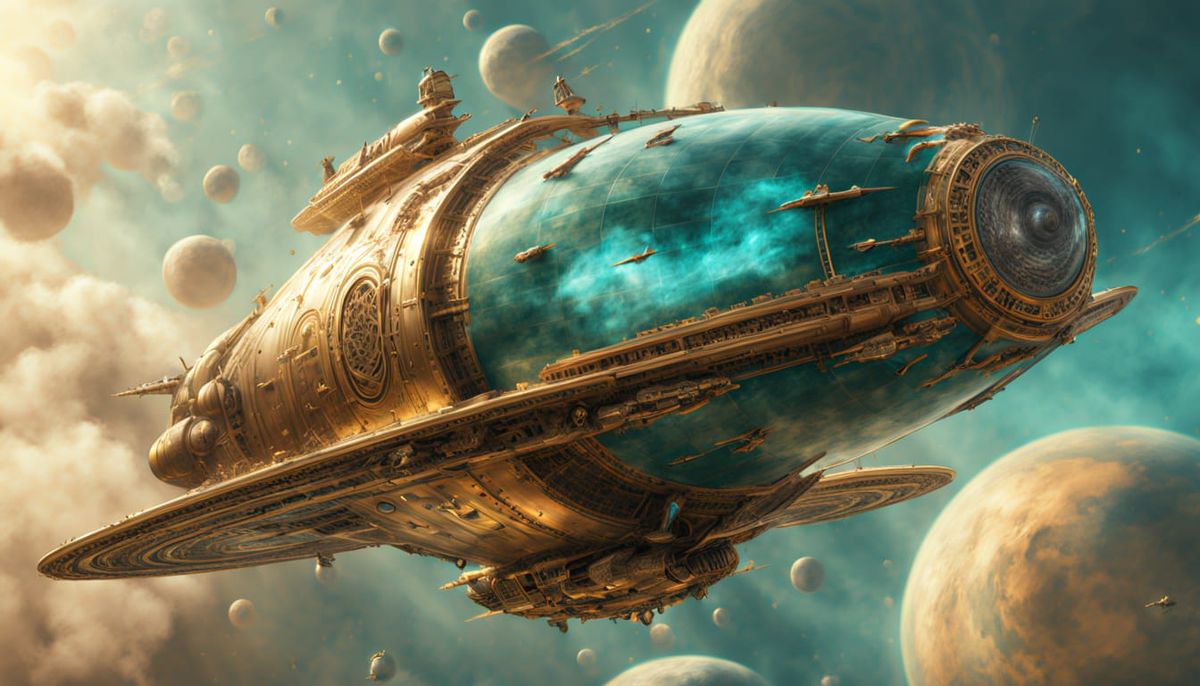 A Renaissance-inspired oil painting of a starship in orbital free fall, with golden lighting on its aquamarine hull and intricate bronze details, set against a soft misty background with warm, high-contrast colors.