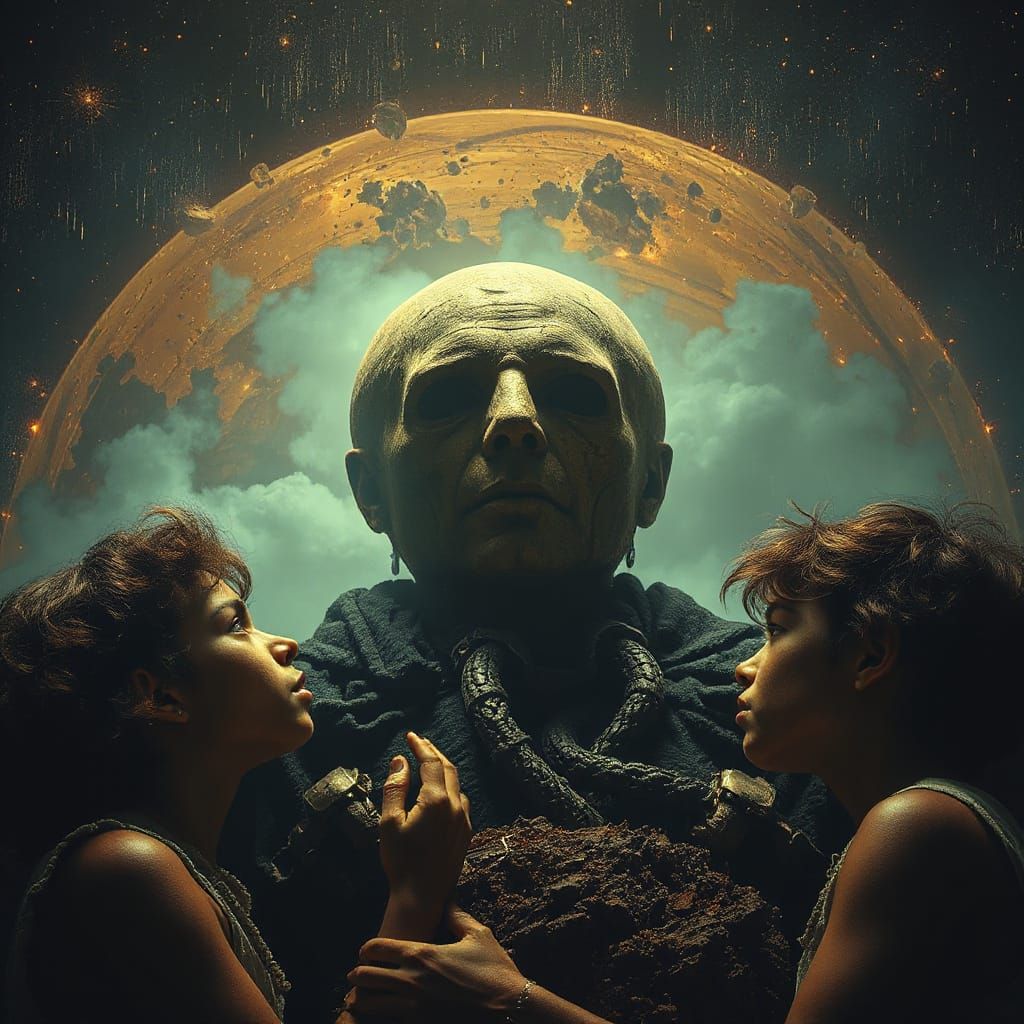 A hyperrealistic image of Saturn consuming youth and generating false avatars. The scene is highly detailed with sharp focus, high contrast, and an atmospheric, cinematic mood.