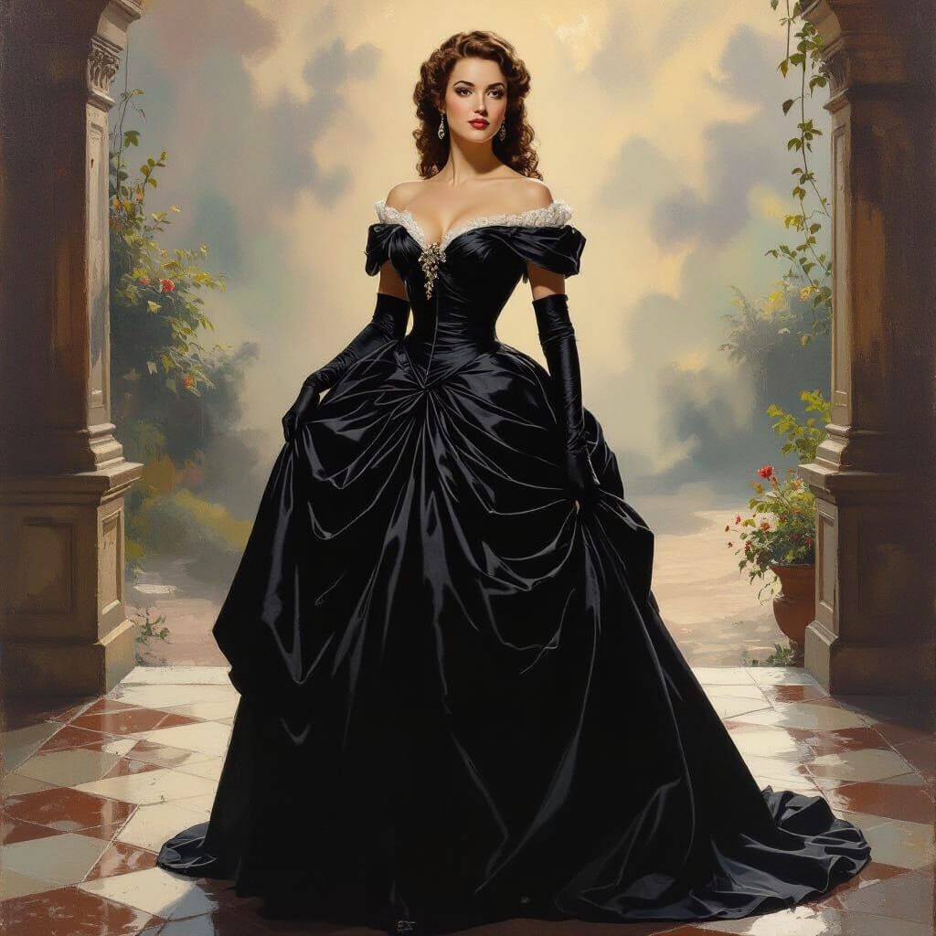 This image shows Scarlett O'Hara in stunning movie scene gowns, rendered with painterly realism. An oil painting with rich textures and dramatic lighting, capturing the era's grandeur.