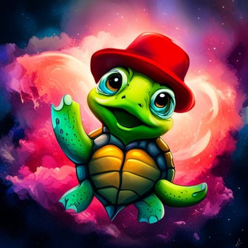 A glossy cartoon of a turtle wearing a hat and holding a red heart, set against a backdrop of stars and galaxies. The artwork has a splash art, graffiti aesthetic.