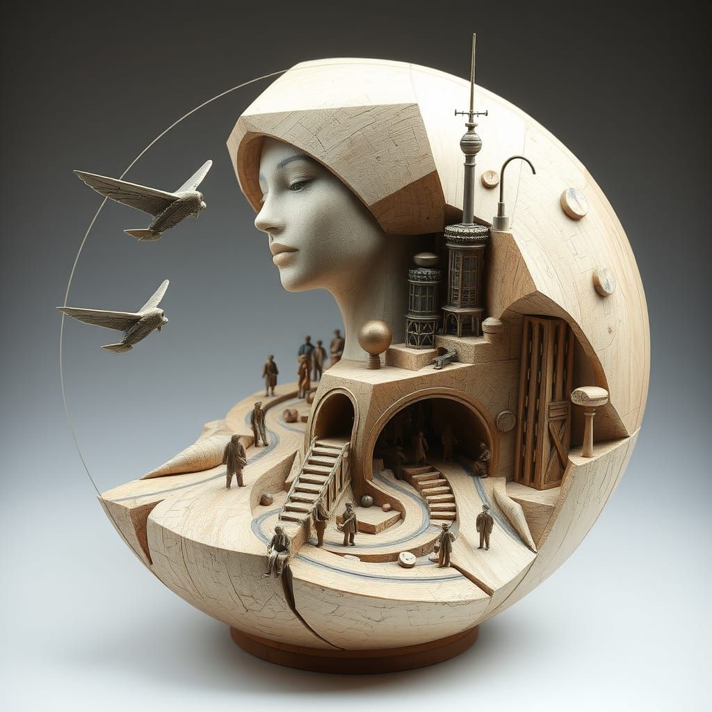geometric postpunk female destroyed sculpture+city object, flying people around, polymer roads-tunnels, curved metal towers, aged wood shape, miniature style
