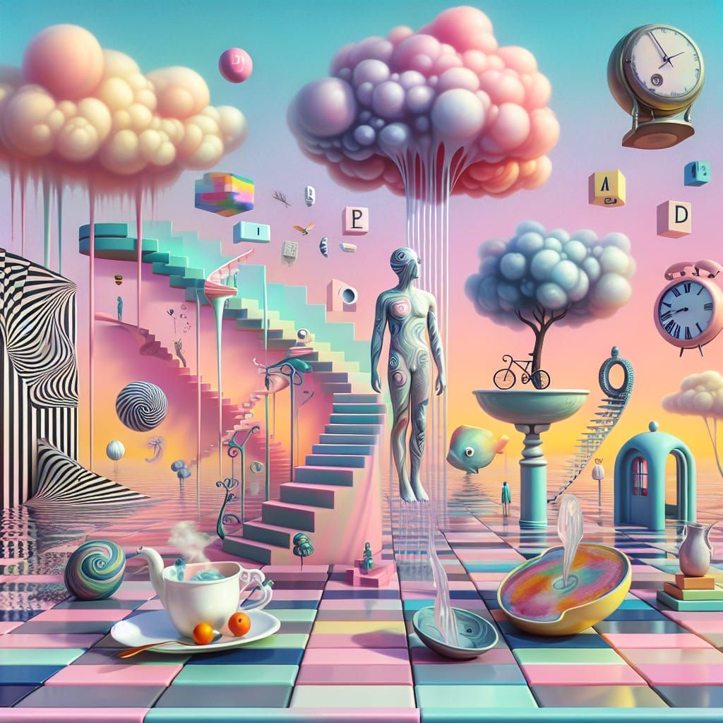 A surreal scene in pastel colors featuring melting clocks, impossible staircases, and floating objects. The image showcases a dreamlike Dadaist aesthetic with absurd and chaotic elements.