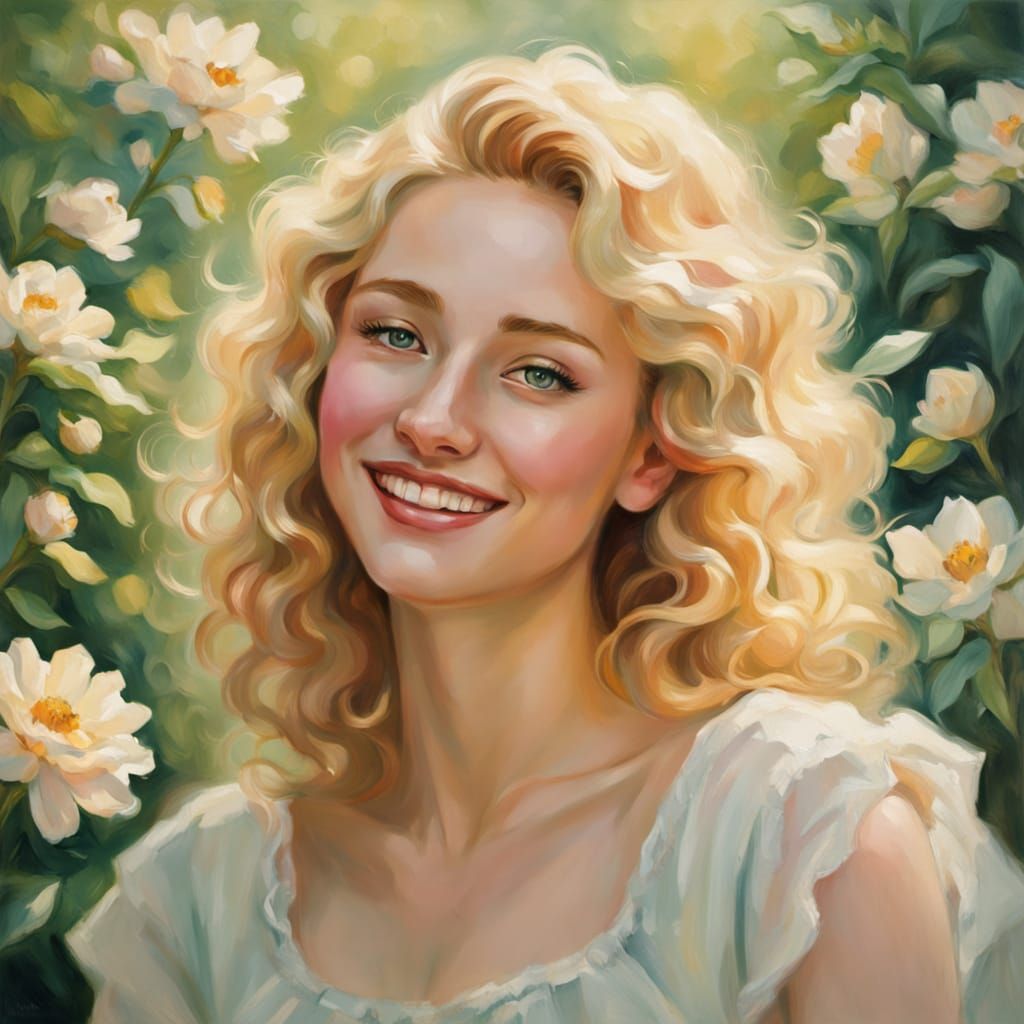 This image shows a young woman with blonde hair and green eyes, smiling softly in a sun-dappled garden. Painted in an impressionistic style, it captures a moment of serene joy with warm, golden hour light.