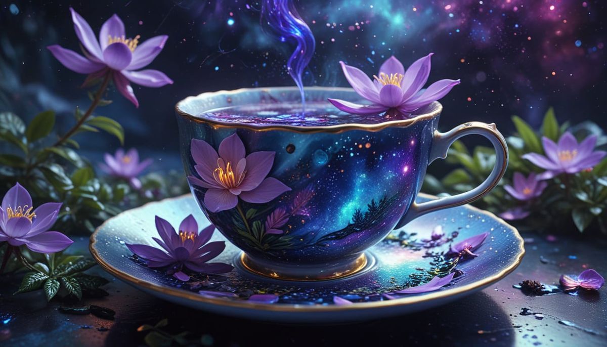 A surreal teacup scene set in space. The cup brims with exotic plants, their iridescent petals shimmering in starlight and soft mist. The artwork is rendered as a hyper-realistic digital painting with a pastel color scheme.